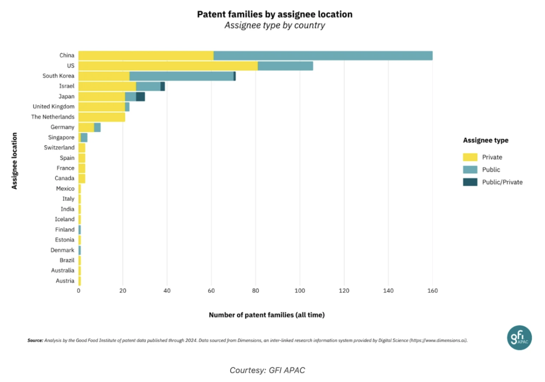 中国在细胞培养肉领域的专利申请数量处于全球领先地位