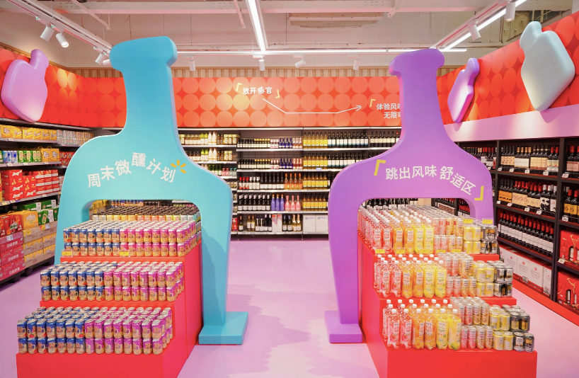 所谓「玛薯店」,也是沃尔玛结合小红书用户需求洞察,对线下门店的几个区域做了不同主题的场景打造和动线改造,比如将酒区域改为「感官冒险岛」,提供酒饮特调体验与风味探索,解锁自制特调配方;将毛绒区域改为「毛绒童心岛」,用卡通装置布置出一个治愈的打卡空间。
