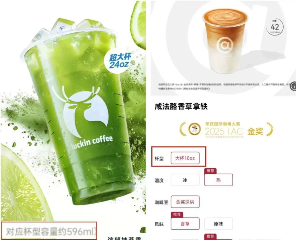 近年来,国内部分咖啡品牌也曾使用盎司作为容量单位。如瑞幸曾以24oz标注超大杯容量,并在下方以小字注明对应的毫升数596ml,而库迪分别将中杯、大杯容量设定为12盎司和16盎司。