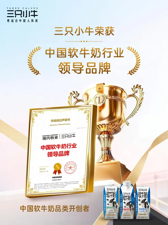 随后,“软牛奶”这一细分概念产品也带来了市场意义上成功。2024年12月,三只小牛获得全球权威机构弗若斯特沙利文认证的“软牛奶品类开创者”称号;次年11月,进一步被授予“中国软牛奶行业领导品牌”认证。