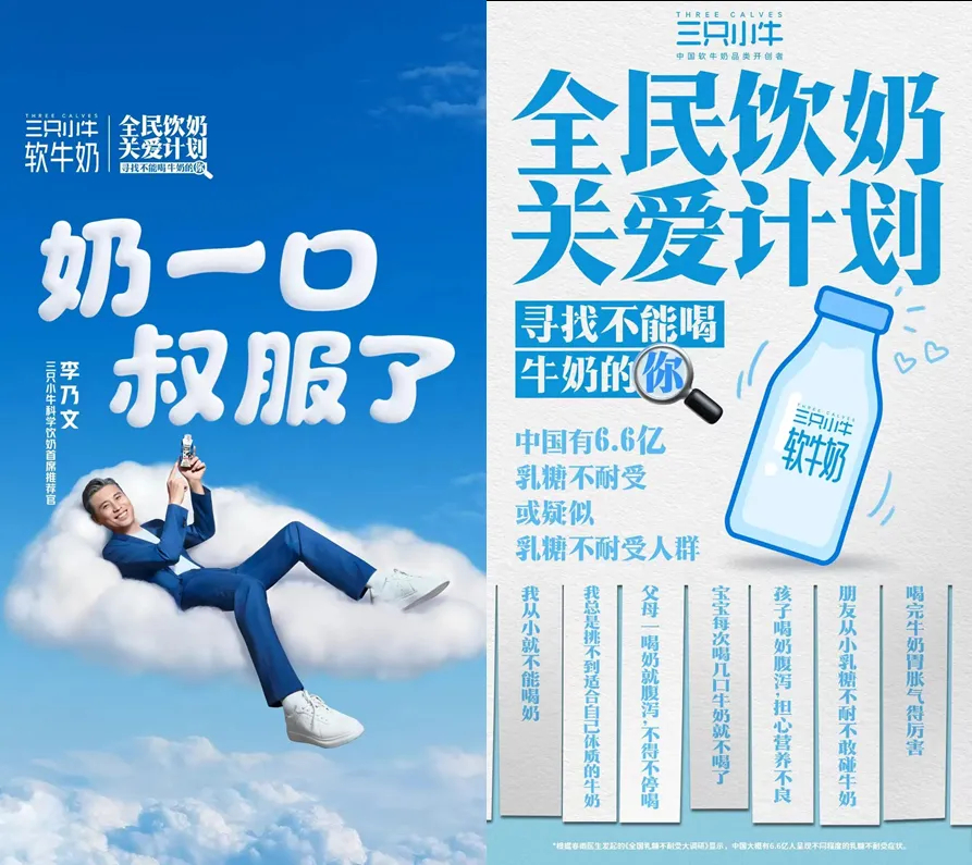 作为“软牛奶”品类的开创者,三只小牛早在三年前行业仍聚焦基础营养时,便率先洞察国人乳糖不耐现状,以“软”为核心切入点,从解决乳糖不耐逐步延伸出“软食养胃”“温和吸收”等价值主张,覆盖更广泛的肠道敏感人群,融入家庭日常饮用场景。