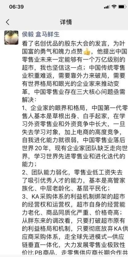 在盒马蹉跎多年的侯毅就对此深恶痛绝,并在第一时间点赞永辉调改:KA采购体系的利益机制,绑架超市的经营权和运营权。