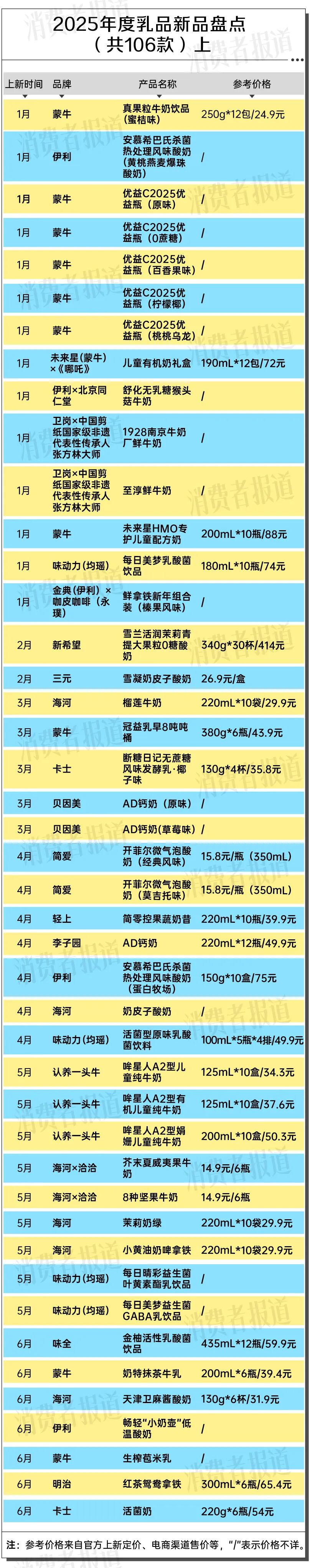 据《消费者报道》不完全统计,2025年乳企推出的106款新品覆盖了纯牛奶、鲜牛奶、酸奶、调制乳等多个品类。