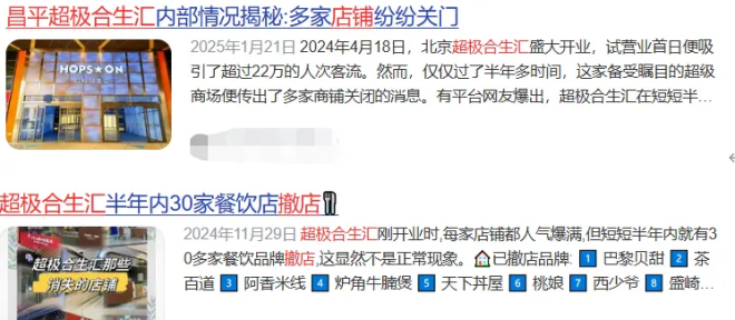 被寄予厚望的新商场也难逃厄运,例如2024年4月开业、被誉为“京北新地标”的北京超极合生汇,试营业首日客流突破22万人次,但仅四个月后,其重点打造的“21街区”就有超过10家餐饮店撤出,半年内累计关店超过三十家。
