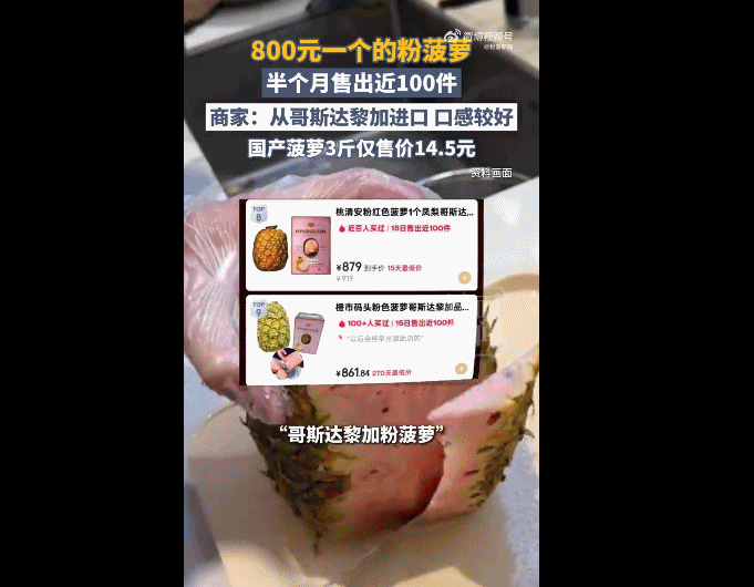 无独有偶,这段时间“粉菠萝”也因高价走红——标价800元/颗。