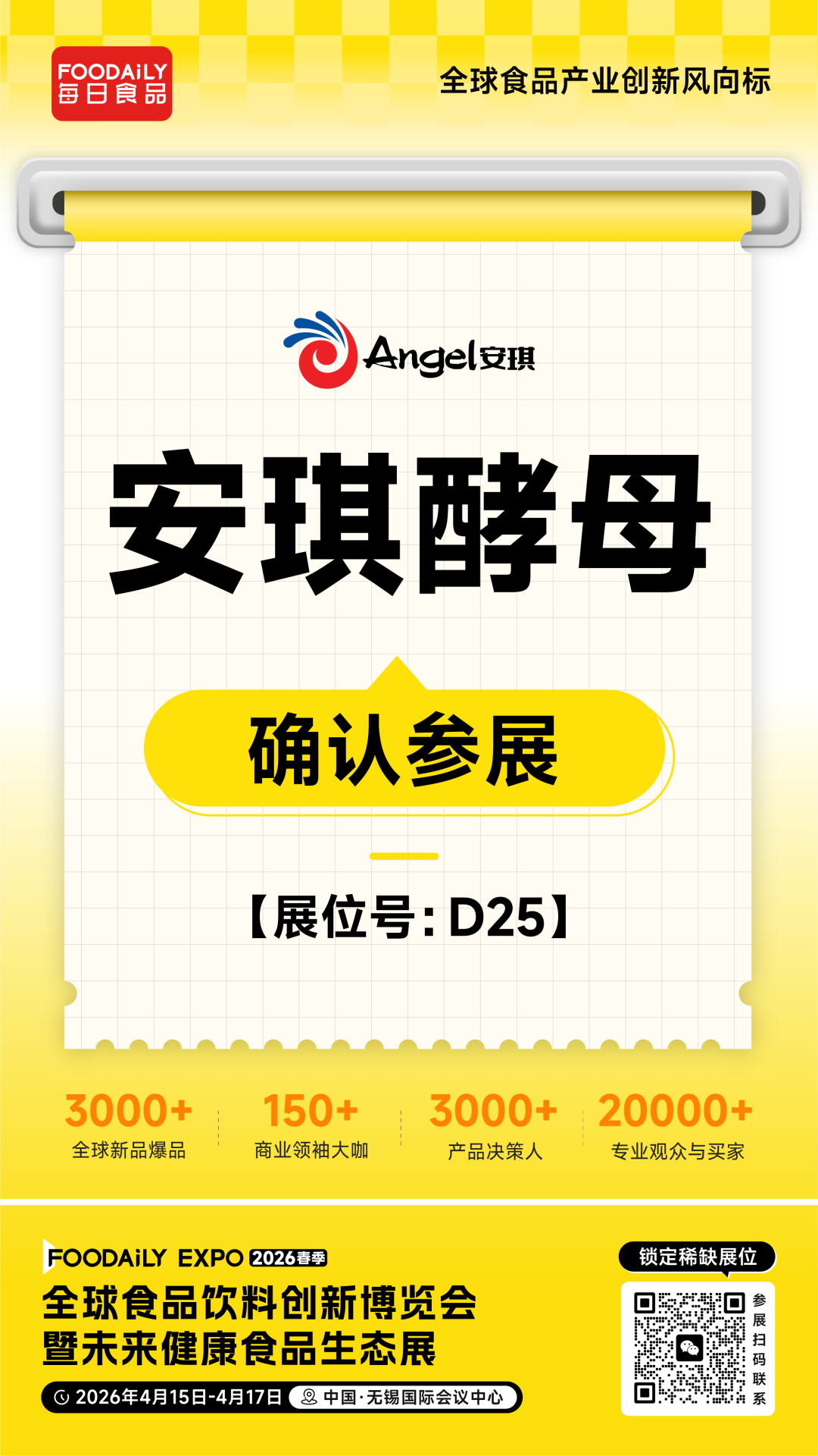 2026 Foodaily创新博览会,安琪将携旗下创新成果AnPro®酵母蛋白亮相无锡国际会议中心,D25展位,与各界伙伴携手,以生物科技创新赋能食品工业,共筑营养、高效、可持续的优质蛋白新未来。