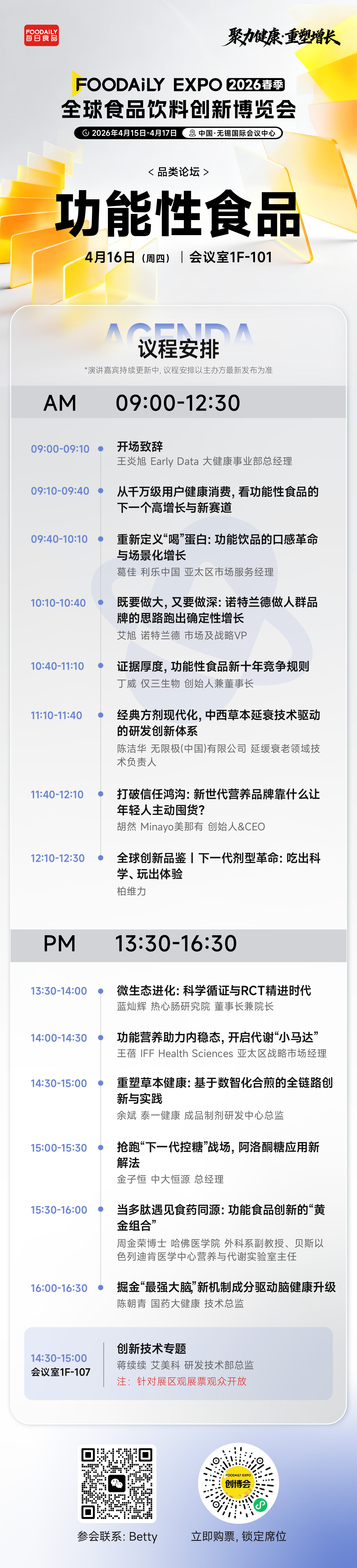 在2026 Foodaily创新博览会的功能性食品品类论坛,我们将深度探讨行业前沿创新:从微生态循证研究、代谢健康与脑力营养等核心方向,到麦角硫因、阿洛酮糖、多肽等新机制成分突破;从高蛋白功能饮品、中西草本现代化研发到下一代剂型革命,系统解析功能食品从科学研究到产品落地的关键路径。