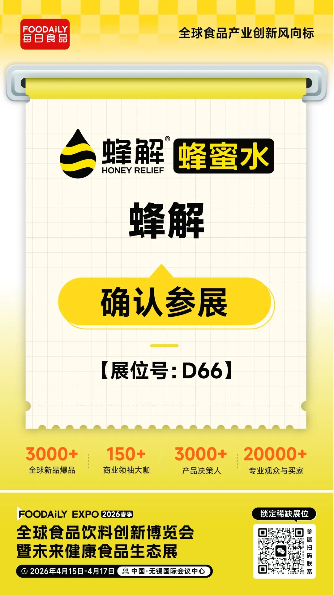 2026 Foodaily创新博览会,蜂解将携旗下一站式蜂产业链服务体系亮相无锡国际会议中心,D66展位,期待与行业同仁共探鲜调蜂蜜水创新新路径,共启蜂产业链创新新未来!