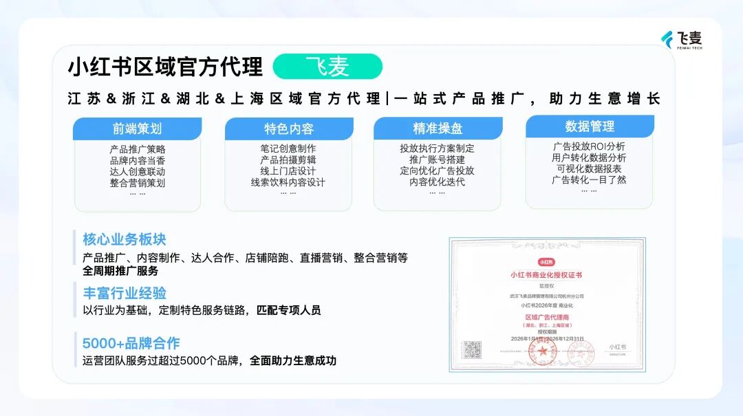 飞麦(FEIMAI TECH)作为小红书区域官方代理商 ,始终致力于通过专业的营销策略助力商家生意增长。核心服务区域覆盖江苏、浙江、湖北及上海,服务范围横跨服装配饰、珠宝文玩、食品餐饮、日用 3C、教育培训、商务服务、家居建材以及互联网手游等多个关键赛道。作为深耕小红书生态的资深合作伙伴,飞麦凭借深厚的行业底蕴,已先后为累计超过20000家客户提供了从效果增长到策略共创的全方位服务。