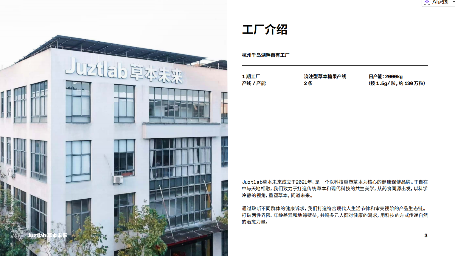 公司一句话亮点:Juztlab草本未来是一个以科技重塑草本为核心的健康产品品牌,并自有工厂,提供OEM/ODM代工。