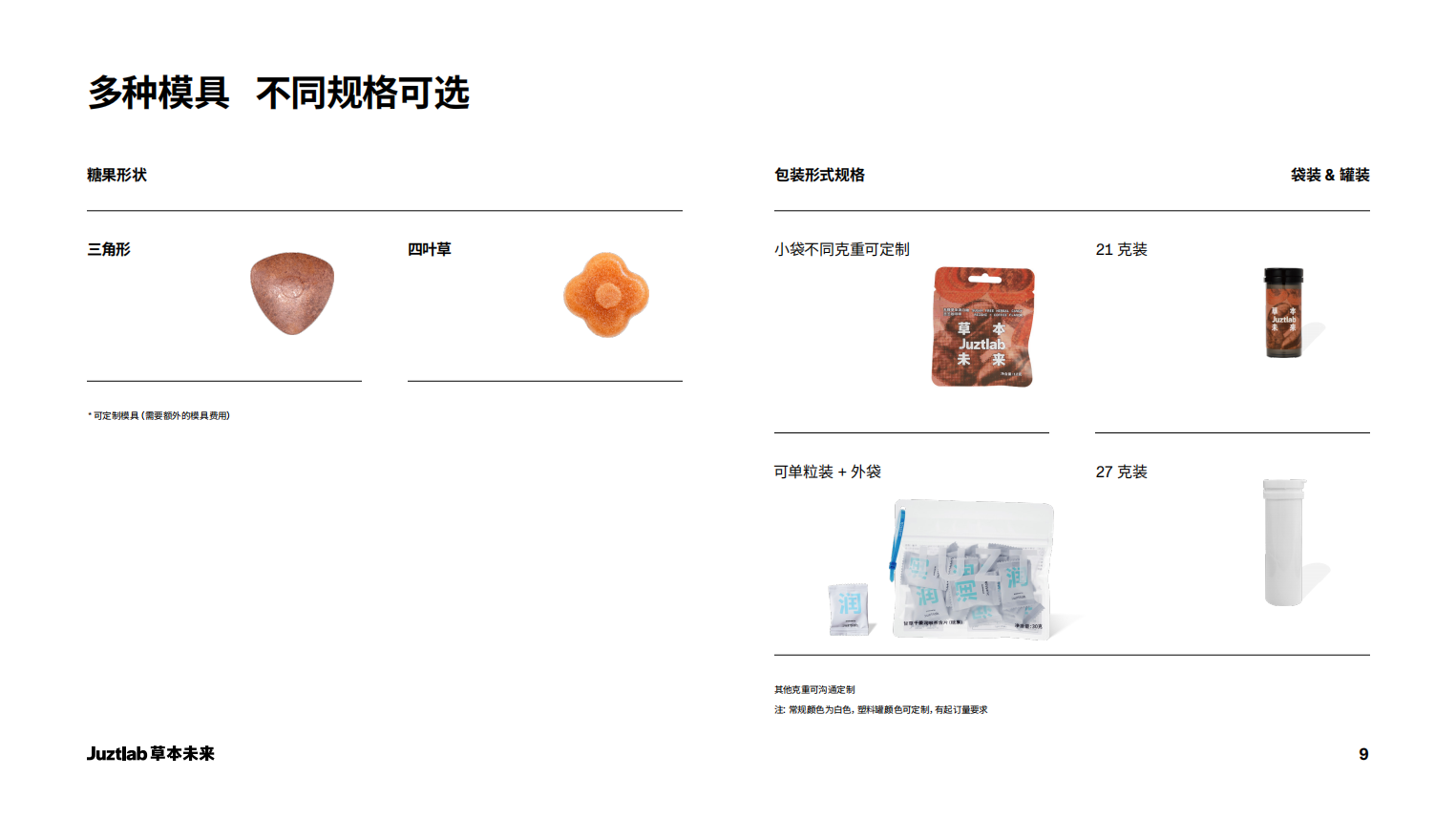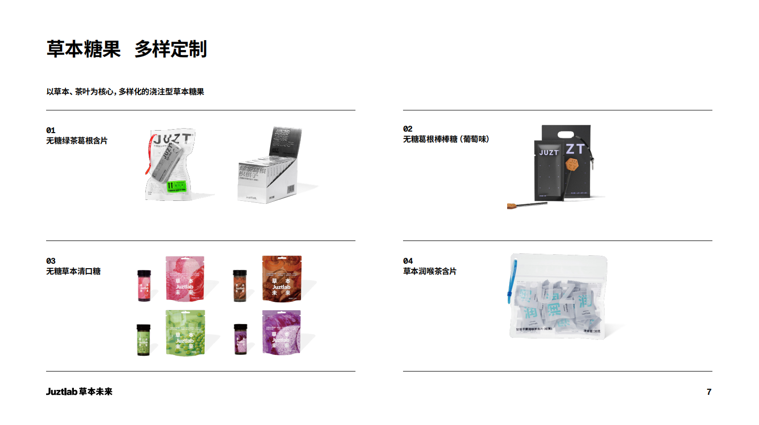 公司围绕草本和技术,目前3大核心产品线,包括:JUZT,Juztlab,Juztlab草本未来;同时已在杭州千岛湖自建工厂,可提供一站式草本茶含片(糖果)的OEM/ODM代工定制服务。