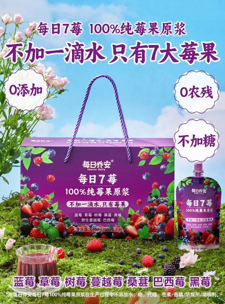 10月17日,每日乔安官宣上新7莓纯莓果原浆。据官方介绍,该新品以哈佛医学院推荐的莓果为核心原料,配料仅含大兴安岭蓝莓与野生蔓越莓、黑龙江尚志红树莓、丹东草莓、黑龙江寒带桑葚、黑龙江黑莓,以及巴西亚马逊巴西莓7大黄金产区枝头熟果,并采用整果鲜制 + 低温锁鲜工艺,完整保留花青素、多酚、熊果酸等营养,且通过了600项0农残检测,0 香精、0 糖代糖,不加水,完美契合《中国居民膳食指南(2025)》“足量、多样吃水果” 的高阶健康需求。