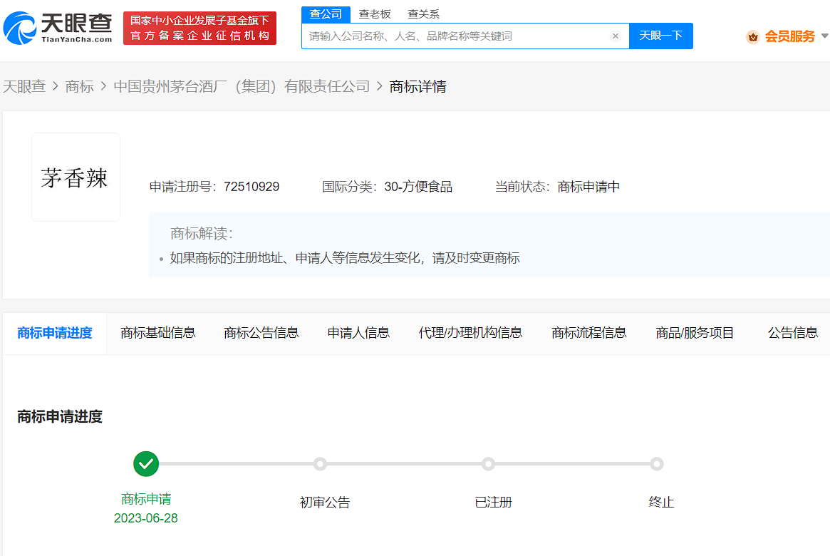 根据天眼查显示,中国贵州茅台酒厂(集团)有限责任公司最近申请注册“茅香辣”和“茅小椒”商标,商标的国际分类为方便食品。目前,商标状态均为申请中。原文链接