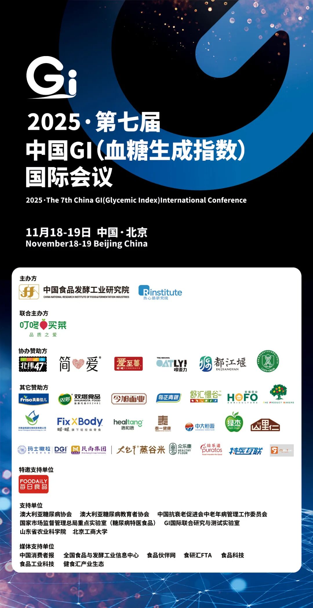 活动简介:2025年11月18-19日(17日现场报到),由中国食品发酵工业研究院主办的2025·第七届中国GI(血糖生成指数)国际会议将在北京举行,主题为“数字驱动低GI产业健康发展”。