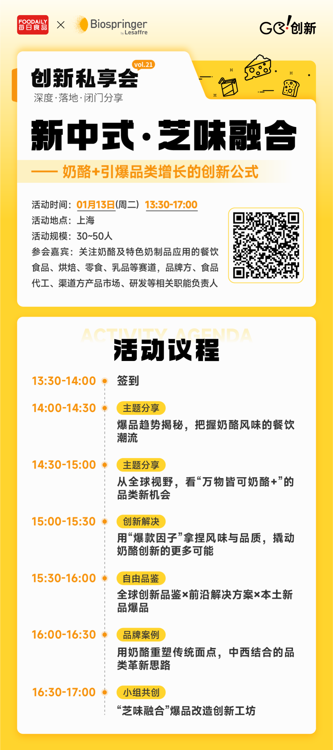 参与嘉宾:关注奶酪及特色奶制品应用的餐饮、食品、烘焙、零食、乳品等赛道品牌方、食品代工、渠道方;产品、市场、研发等相关职能负责人。