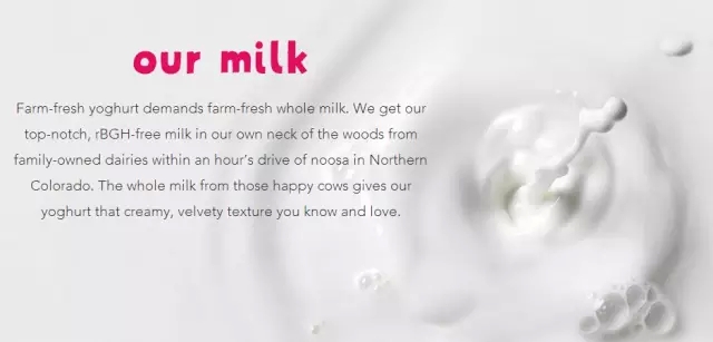 Noosa的配方来自 Koel Thomae 家乡的一个澳大利亚家庭品牌,诞生的原因同样是创始人怀念儿时的酸奶口味,于是将家乡的味道传承了下来,目前在美国科罗拉多州生产。Noosa 的联合创始人之一Koel Thomae讲述了澳大利亚式酸奶的秘诀,不同于希腊或冰岛酸奶,Noosa不是脱乳清酸奶,因此在这个方面与传统酸奶很像。由于使用全脂牛奶,口感奶味浓郁、光滑柔软。