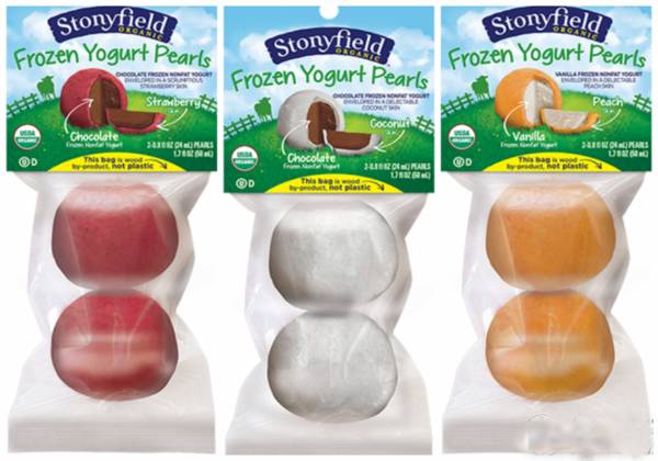 该系列产品首先在波士顿地区四家全食超市(Whole Foods)推出,以木质纤维制成的纤维素袋子提前包装好, 放置于超市的冷冻区售卖。由于外壳由水果皮制成,因而它可以具有不同风味。Stonyfield 的珍珠球系列就包括巧克力口味和香草口味的有机酸奶产品,搭配草莓、香蕉、椰子以及桃子表皮,共具有七种不同的风味组合。