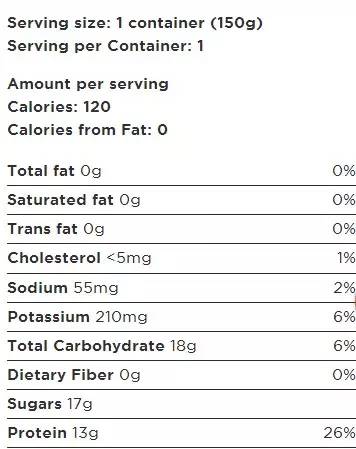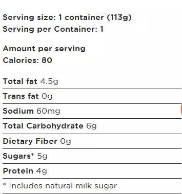 每113g中,卡路里80,反式脂肪为0,蛋白质4g,钙含量为25%,并且指出所含的糖为牛奶本身的,并不是额外添加的。