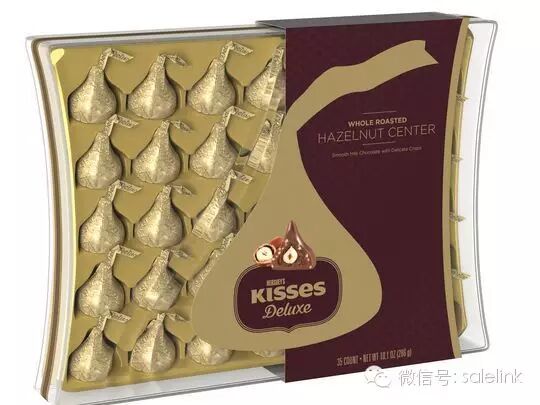 这种豪华版的巧克力针对节日礼品市场,卡路里为原来的两倍,脱掉银色铝箔,换成了金色的铝箔包装。“我们花了 55 年才改变铝箔的颜色。” Adam Borden,好时 Kisses 的高级经理在宣布时说,“然后又花了 38 年在牛奶巧克力里面加一些其他的东西。”