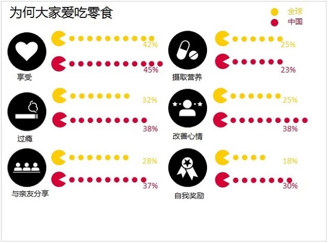 相比过去,今天的中国消费者面对的是压力更大、节奏更快的生活,因此他们更愿意通过消费来为自己的生活带来新鲜感。折射在零食市场中,更多的中国消费者愿意将享受零食作为一种对自己辛苦工作的犒赏(30% vs全球平均18%),或是紧张工作中的一次小小的放松(24% vs全球平均18%)。