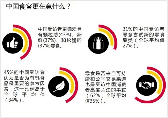 尼尔森零食报告显示,相比于全球,中国消费者更偏爱具有颗粒感、新鲜和松脆的零食,更愿意尝试新的零食品类,把是否为有机食品作为重要的参考因素,并且关注零食是否来自可持续和公平交易渠道。