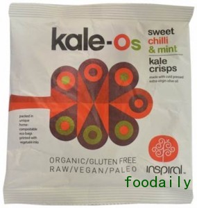 产品描述:Inspiral Kale-Os Sweet Chilli & Mint Kale Crisps声称用有机绿色羽衣甘蓝叶加新鲜薄荷、cayenne辣椒和橄榄油沙拉制成。该款零食的原料经低温干燥,搭配冷压特级初榨橄榄油。它不含坚果、谷蛋白、反式脂肪和丙烯酰胺,因为是完全有机的,所以无杀虫剂,而且十分清脆。该款零食的份量达到每日五果蔬份量的五分之一,适合吃素食和古石器时代饮食的人群,而且它是使用100%可再生电力生产的。