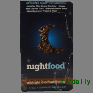 产品描述: NightFood午夜巧克力脆营养棒( Midnight Chocolate Crunch Optimized Nighttime Nutrition Bars)满足晚餐后对零食的渴望,帮助控制饮食,改善睡眠,提供蛋白质和纤维素。这款犹太认证产品热量较少,是更好的夜间零食。