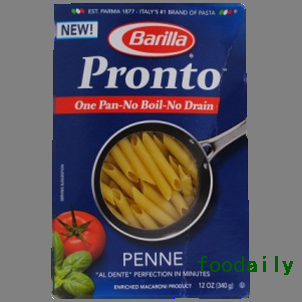 产品描述: Barilla Pronto 通心粉是一款强化意面,声称用一个平底锅就能拿煮,不需要等水沸腾再放进去煮,捞起来的时候也不需要滤水。这款犹太认证的产品声称几分钟就能煮得劲道适中。