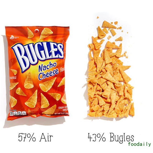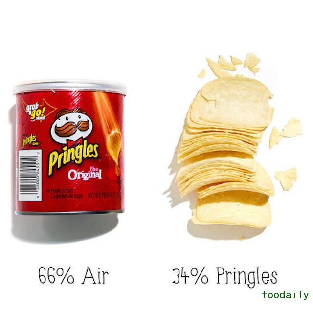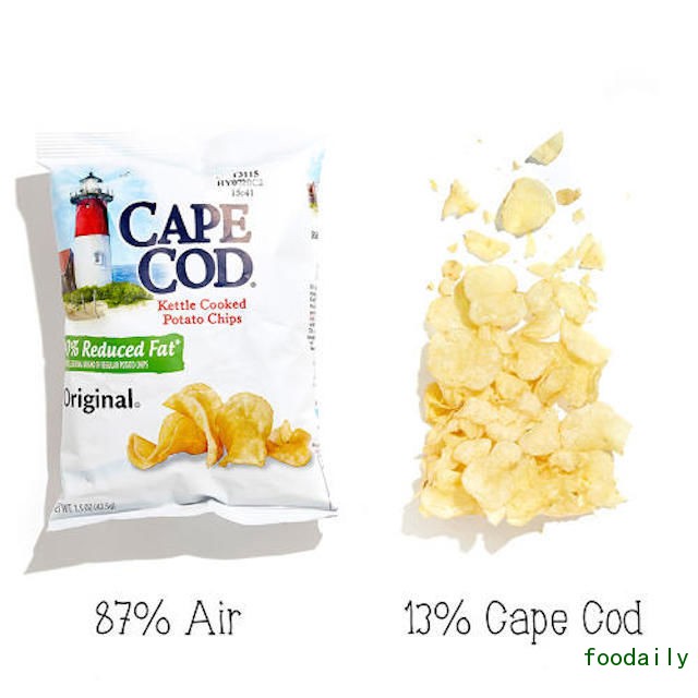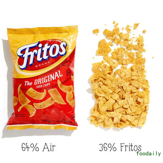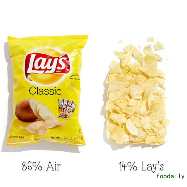 理论上讲,填充进食品袋的必须是稀有气体(空气肯定是不行的,21% 的氧气会让食物变质)。有些稀有气体价格偏高,所以商家通常选择氮气。他们把包装袋做大,另外一个考虑是保存薯片的完整性,避免它们在运输中挤成渣渣。大包装也让食物看起来更多一些。但这种做法却带来了污染和浪费。
