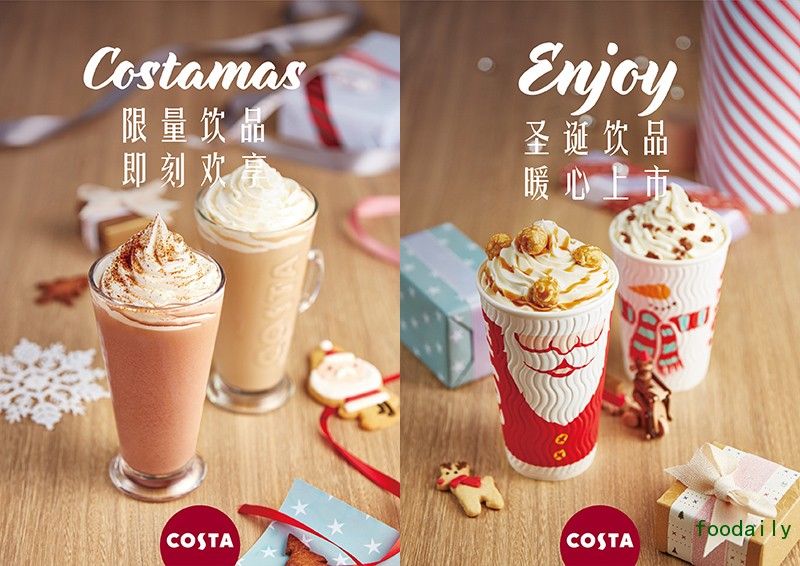 COSTA 从 11 月 6 日开始已经进入到圣诞期(星巴克是 11 月 3 日开始的),新的饮品有布蕾焦糖拿铁、姜饼曲奇拿铁,另外还有两款只有 12 月才限量供应的英式黑麦芽风味拿铁和圣诞蛋酒热巧克力,最近路过 COSTA 的同学可以留意一下,尝个新吧。