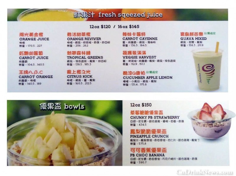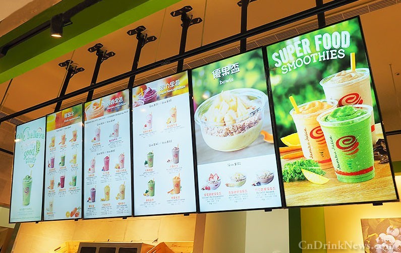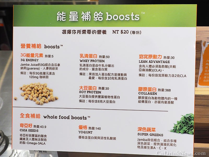 Jamba Juice,主打24~33元果昔,果汁不加水和糖,可搭配低脂的雪波冰淇淋、优格,或自选蔬菜、豆奶等,吸引20~40岁消费人群。除了完全取之自然的食材,Jamba Juice的另一项特色就是「Boots能量补给配方」顾名思义就是能增加人体所需的营养,象是胶原蛋白、乳清蛋白或是富含膳食纤维的奇亚籽等等,可供大家与果昔搭配,健康加倍!