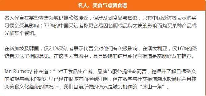 万博宣伟亚太区首席策略官 Ian Rumsby 表示:《亚太区食品消费趋势报告II》显示,食品文化影响不仅仅局限于小众 “美食家”群体,也在亚太区广大普通消费者中形成强烈的兴趣,甚至在某些情况下,成为众人关注的问题。