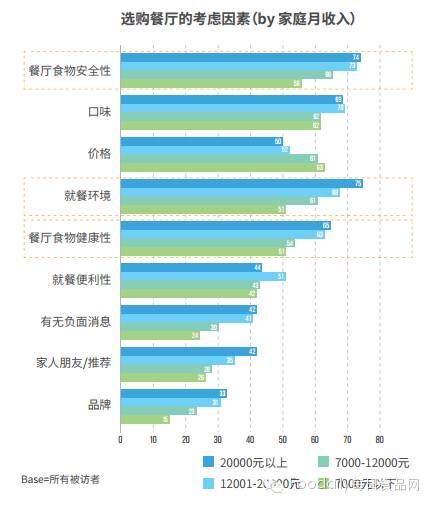 家庭收入越高,消费者对食品安全性、食品健康性与品牌重视程度越高;同时对餐厅食物安全性、食物健康性与就餐环境的重视度更高。