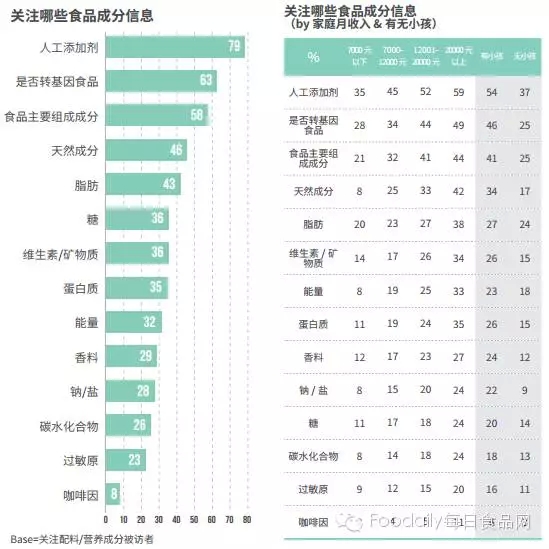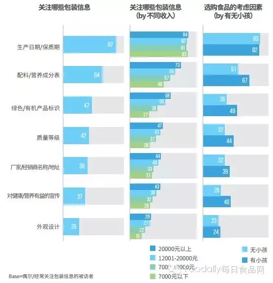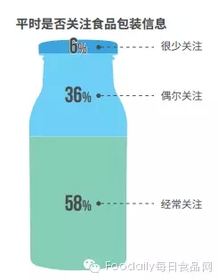 近六成消费者表示经常会关注食品包装信息;生产日期/保质期是消费者最关注的包装信息;同时,消费者对配料/营养成分表与绿色/有机产品标识亦较关注;对于食品成分信息,消费者对人工添加剂与是否转基因给予很高关注。