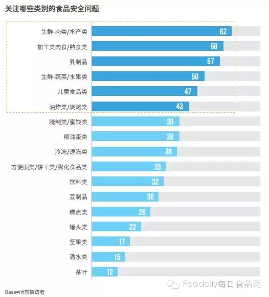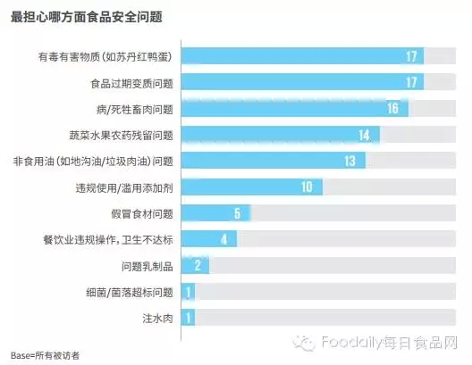 对于具体的食品安全问题,消费者对有毒有害物质、食品过期变质、病/死牲畜肉问题、蔬果农药残留、地沟油与违规/滥用添加剂给予了较高关注;整体上,生鲜-肉类/水产类、加工类肉食/熟食、乳制品、生鲜 -蔬菜/水果、儿童食品、油炸/烧烤类是消费者较关注的食品安全问题食品类别。
