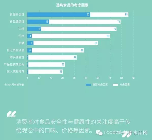 食品安全性是消费者在选购食品 / 外出就餐时最重要考虑因素;同时,食品健康性也是消费者非常关注的一个因素;结合近三年数据来看,消费者对总体食品安全的关注度呈持续上升趋势。