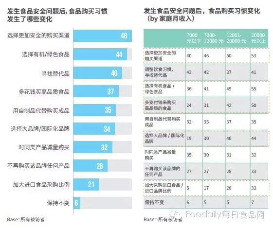 食品安全问题对品牌与行业发展有至关重要影响,而这种影响正在提升;食品安全问题发生后,消费者购买习惯也随之发生变化,主要包括选择更加安全购买渠道、选择有机/绿色食品、寻找替代品、多花钱购买高质食品等;家庭收入越高,消费者的购买习惯变化越明显。
