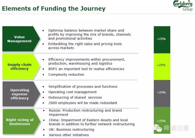具体而言,嘉士伯会专注于价值管理、供应链效率、运营成本效率和业务精简四个方面。