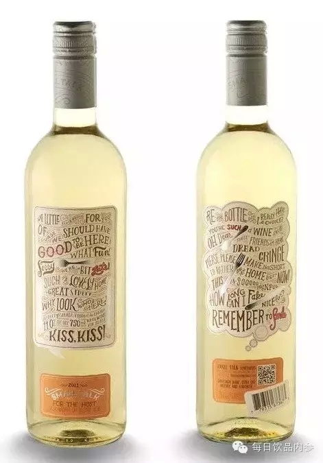 Small Talk Wine 不是用来独酌的,它就是你参加聚会时用来送人的。酒瓶的正面是人们在聚会时常说的话,而背面是大家内心的真实想法。所以送人的时候一定记得正面朝外。