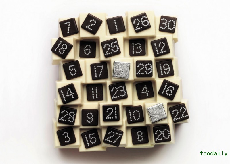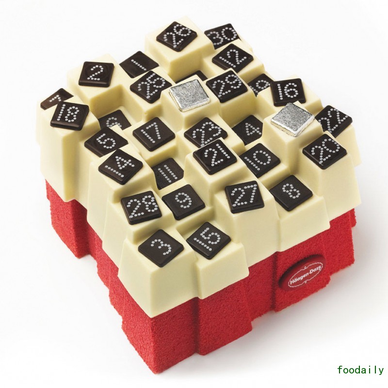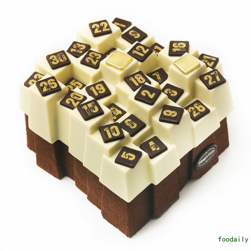 今年,与哈根达斯合作的是来自意大利的室内设计师 Paola Navone。她在冰淇淋蛋糕上用白巧克力做了一个可食用的日历,将 12 月 1 日至 31 日的数字用 31 块标有黄色数字的巧克力随意地堆叠在白巧克力上,特别的是两块金色与银色的小方块,分别代表圣诞与新年前夜,设计师将这款蛋糕描述为“爆炸状的冰淇淋小砖块”。