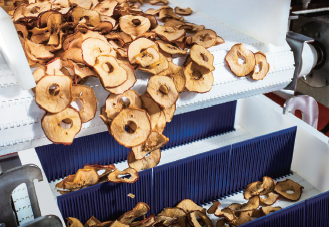 在解决褐变问题后,任务重点是设计苹果片的干燥流程,需要设计多级干燥。关键变量包括苹果片的厚度、干燥时间和温度设定点。实验以不同的方法开始,包括带皮的苹果片及不带皮的;最薄的苹果片更干、更脆,水果味也最浓郁。之后,他们又测试了苹果片的厚度。如果苹果片堆得太高,就会粘连。如果堆得不够高,加工成本上可行性很差。另一个挑战确定翻动产品(不造成破损)的时间,以及最初应该应用的温度和加热时间。气流和温度在作出调整后,产品达到一个比较坚韧的阶段,这时候可以翻动苹果片并降低温度。