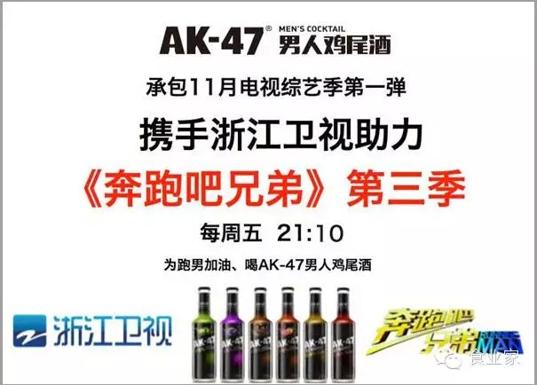 据了解,在此前召开的湖南卫视2016黄金广告资源招标会上,ak-47男人鸡尾酒以1.05亿成功赞助湖南卫视重头综艺节目《全员加速中》。不仅如此,自2015年9月上市以来,ak-47还重金投放浙江卫视《奔跑吧兄弟》第三季黄金时间段广告,并签约跑男团“小猎豹”郑恺为产品代言人,展开了自己的娱乐营销之路。