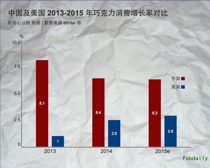 2015 年中国巧克力整体销量增幅降至 6.3%,和去年基本持平,但远低于 5 年前约 20% 的增长幅度。