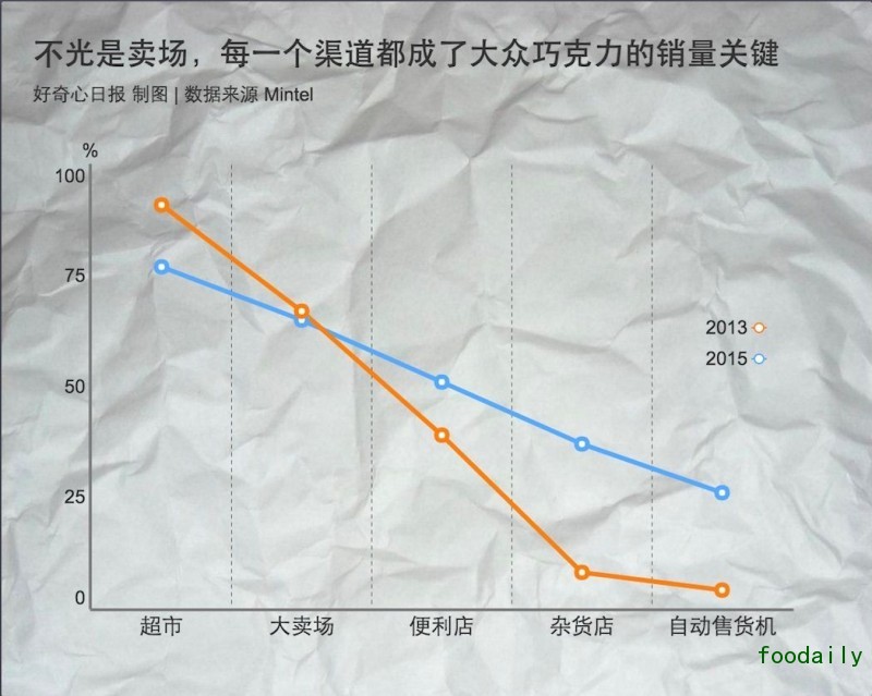 中国的情况也是如此。根据英敏特对中国巧克力市场的调查报告,超市和大卖场——虽然这两个零售渠道本身都在萎缩,依然是消费者购买巧克力的主要场所,但和 2 年相比,去超市和大卖场购买巧克力的人群分别下降了 14% 和 2%,而消费者从便利店、杂货店/小卖部和自动售货机购买巧克力的比率大幅度上升,但并不能弥补主流渠道的下滑。