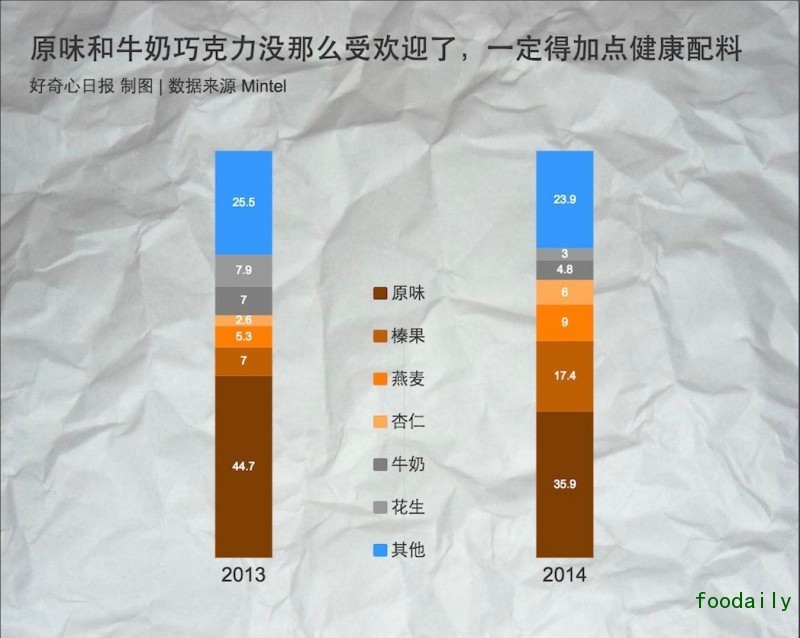 另外一个有趣的现象是,黑巧克力和坚果类型的巧克力取代了牛奶巧克力长时间以来在巧克力界的霸权位置,这进一步验证了我们对健康的诉求比过去强烈了。