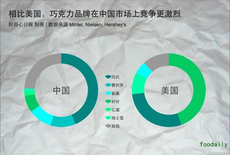 难过的不只是好时。我们所熟悉的那些大牌子巧克力,也被称之为大众巧克力品牌,比如玛氏旗下的 M&M's,德芙等在美国家庭巧克力消费中的占比也都在下滑,而根据市场调研公司英敏特的报告,一直在中国占有绝对优势的德芙,在去年首次丢掉了 0.4% 的销售量份额。雀巢旗下未进入中国市场的核心巧克力品牌 Kitkat 在欧洲的表现同样令人沮丧——过去 5 年失去了将近 1% 的市场份额。