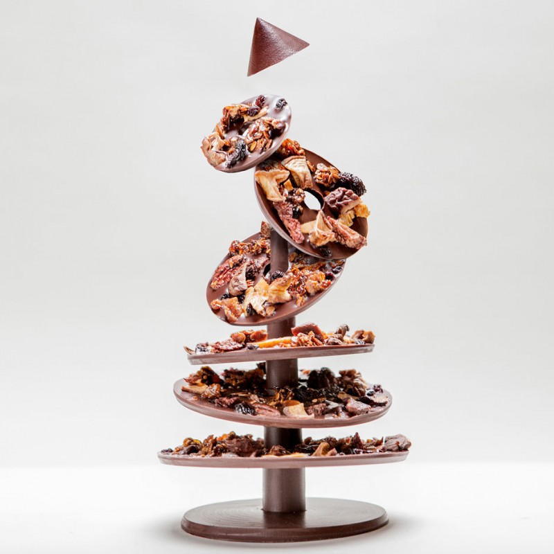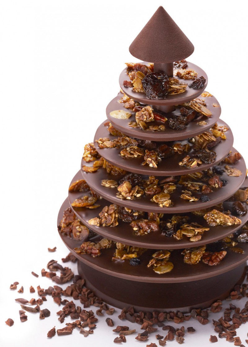 最近,法国巧克力公司 Alain Ducasse 推出的新品是一棵 20 厘米高的巧克力圣诞树,是用一组覆盖有机水果与坚果的巧克力圈和巧克力棒组装而成。
