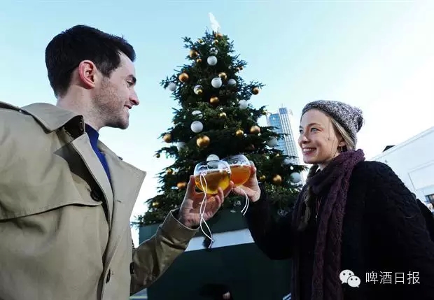 这棵圣诞树不光好看,而且好喝。树上挂着手工吹制的啤酒杯(beerble),前100名参观者可以拿着杯子,在树下畅饮啤酒。