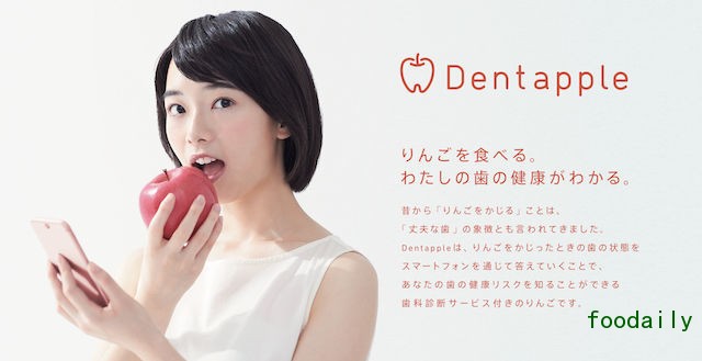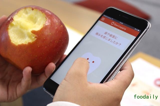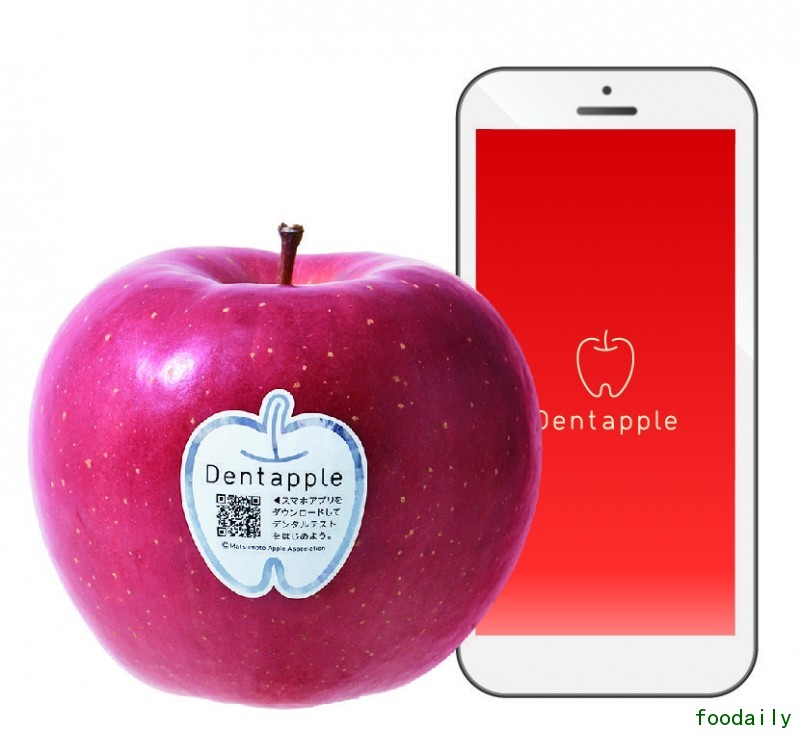 先来看看他们的成果,是一个叫做“ Dentapple ”的企划。这种选自长野县的“藤川苹果被贴上了一张贴纸。从网上或水果铺买来之后,扫一扫上面的二维码,就能下载“Dent apple” APP,而根据程序的步骤,咬两口苹果,回答问题,拍下苹果上的咬痕并提交。1 天之内,你就能收到专业牙医的诊断。