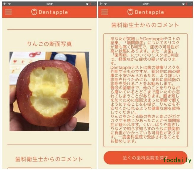有人测试了这款售价 200 日元的 Dentapple,操作完整个流程后,会提示你蛀牙、牙周炎、下颚关节症三种牙病的风险等级,并推荐就近的牙科诊所就医。